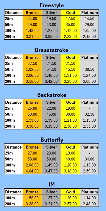 When a swimmer achieves the times above at a meet, they will be awarded with the relevant certificate. The aim is for swimmers to collect the full set. The idea is to encourage swimmers to achieve faster times, earn PBs and to progress to the next certificate. Certificates are issued by the Head Coach when the times are reached.